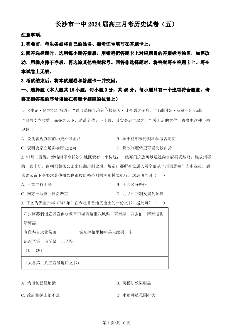 湖南省长沙市第一中学2023-2024学年高三上学期月考(五)历史