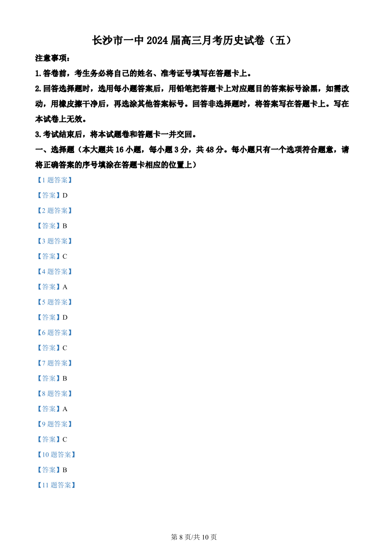 湖南省长沙市第一中学2023-2024学年高三上学期月考(五)历史答案