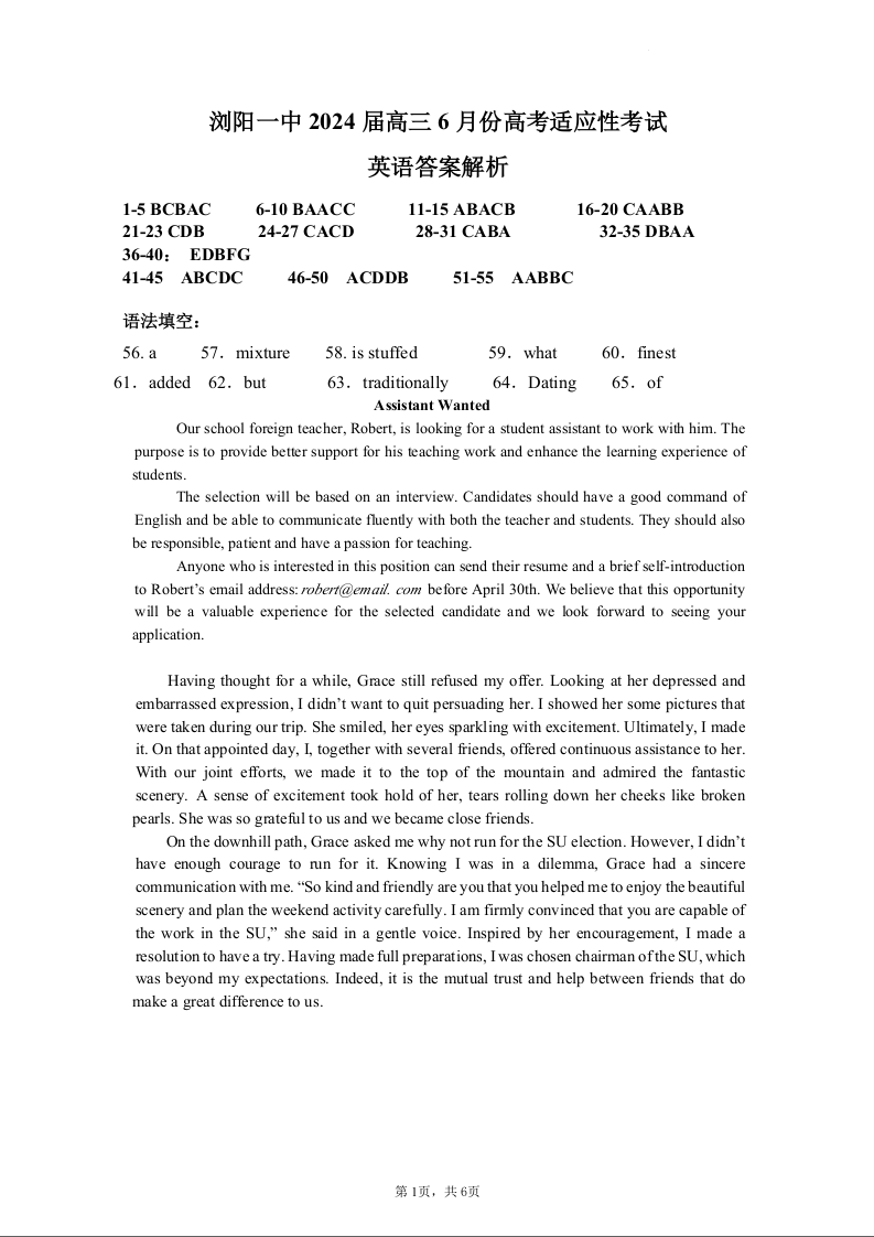 湖南省长沙市浏阳市第一中学2024年6月份高考适应性考试+英语答案