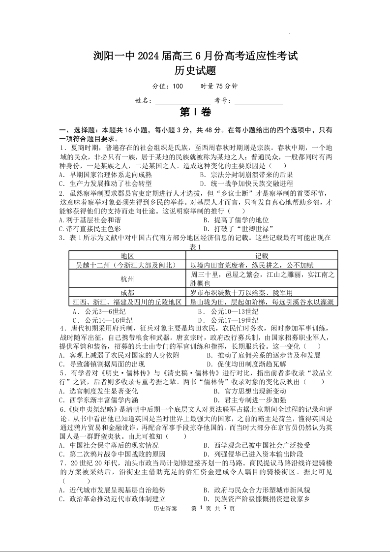 湖南省长沙市浏阳市第一中学2024年6月份高考适应性考试+历史