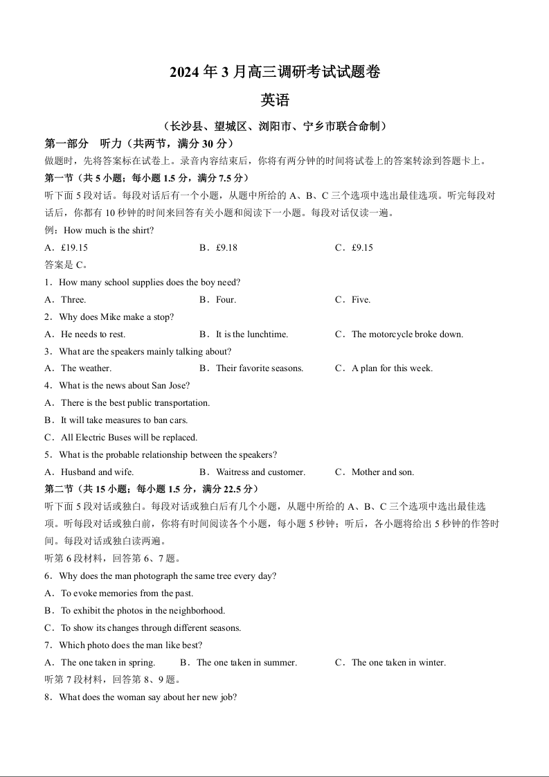 湖南省长沙市长沙县、望城区、浏阳市、宁乡市2024届高三下学期3月调研考试英语试题卷