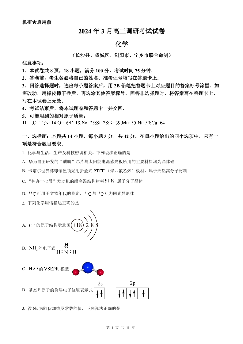 湖南省长沙市四区2023-2024学年高三下学期3月调研考试(一模)化学试卷(原卷版)