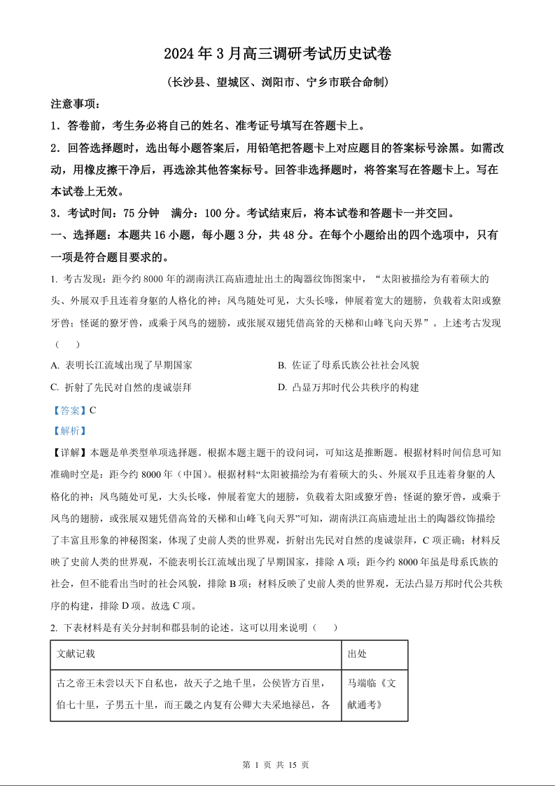 湖南省长沙市2023-2024学年高三下学期3月调研考试历史试卷(解析版)