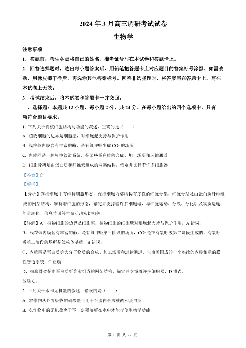 2024届湖南省长沙市四区高三下学期3月调研考试生物试题(解析版)