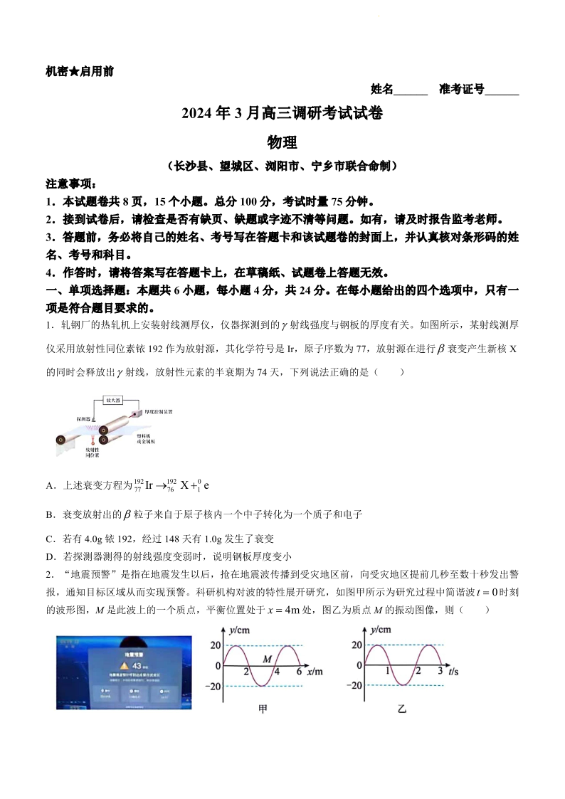 2024届湖南省长沙市四区高三下学期3月调研考试(一模)物理试卷