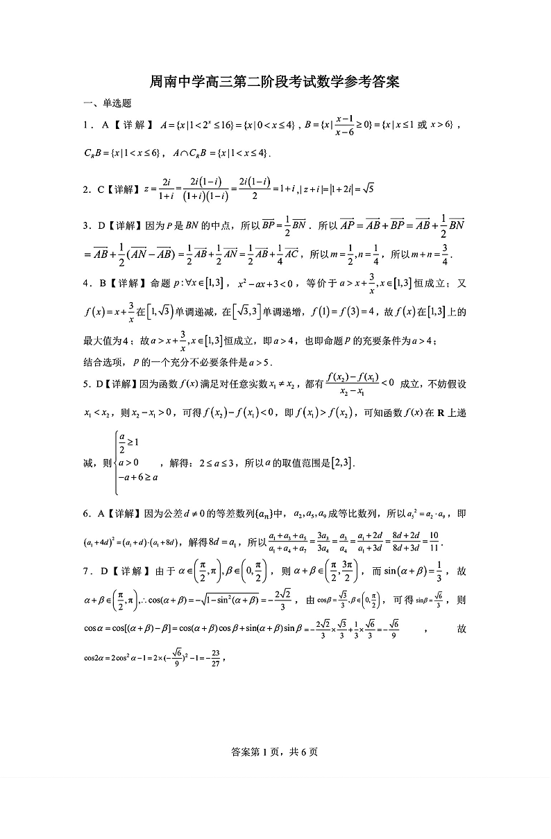 湖南省长沙市周南中学2025届高三上学期第二阶段考试+数学答案