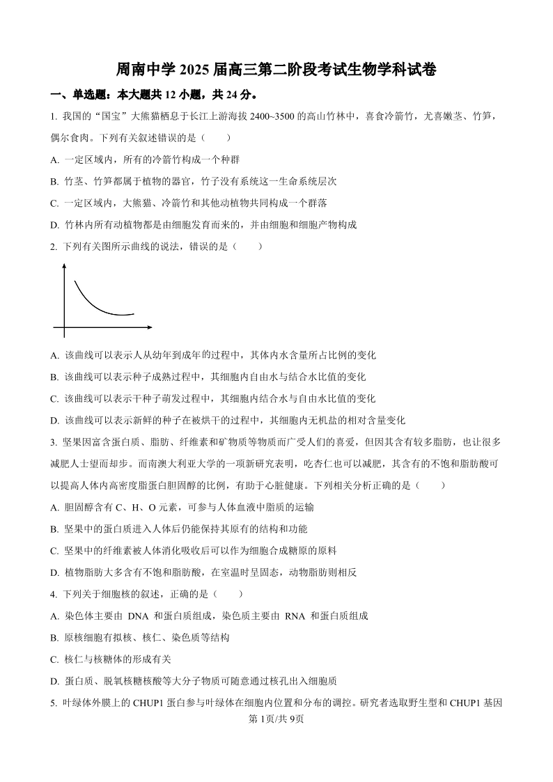 湖南省长沙市周南中学2025届高三上学期第二阶段考试+生物