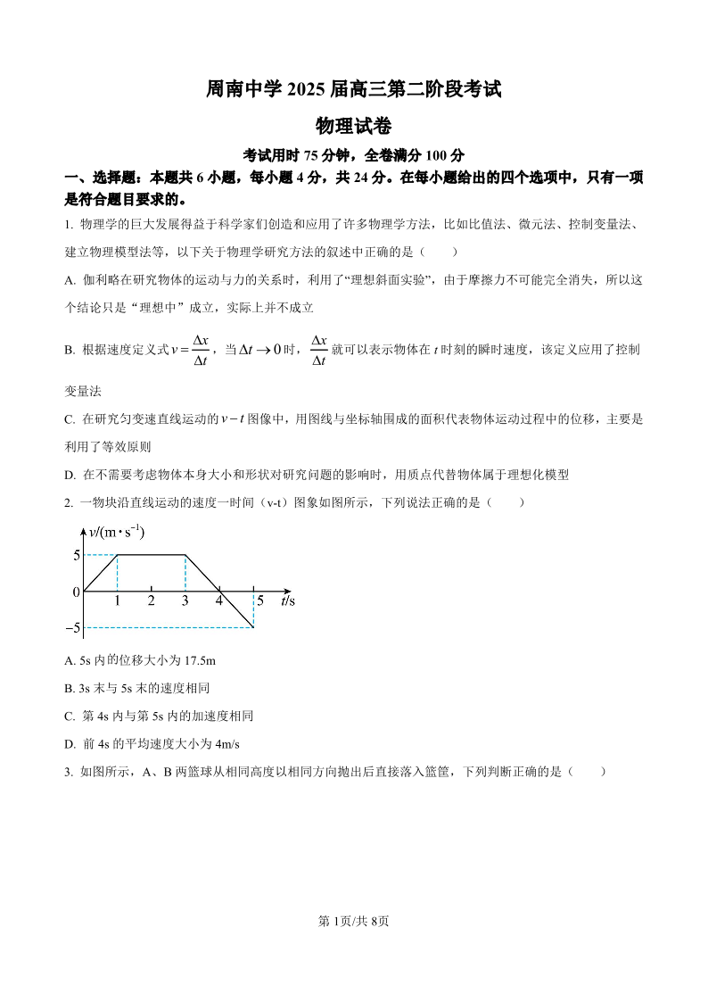 湖南省长沙市周南中学2025届高三上学期第二阶段考试+物理