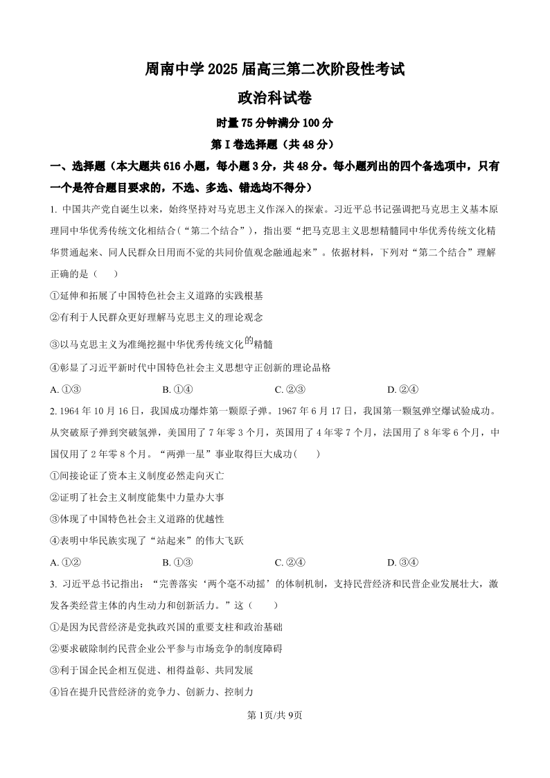 湖南省长沙市周南中学2025届高三上学期第二阶段考试+政治