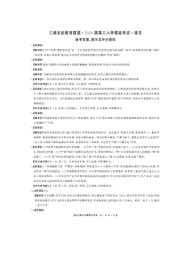 湖南天壹联盟三湘名校2023-2024学年高三下学期入学摸底考试 语文答案