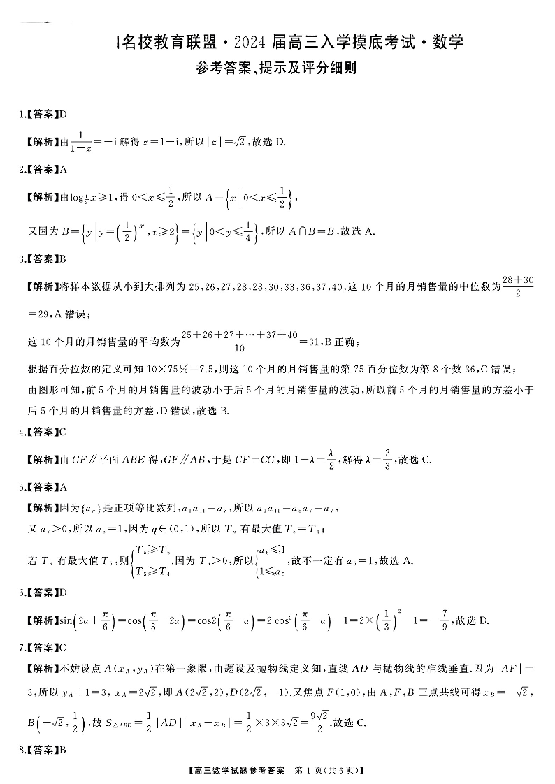 湖南天壹联盟三湘名校2023-2024学年高三下学期入学摸底考试 数学答案