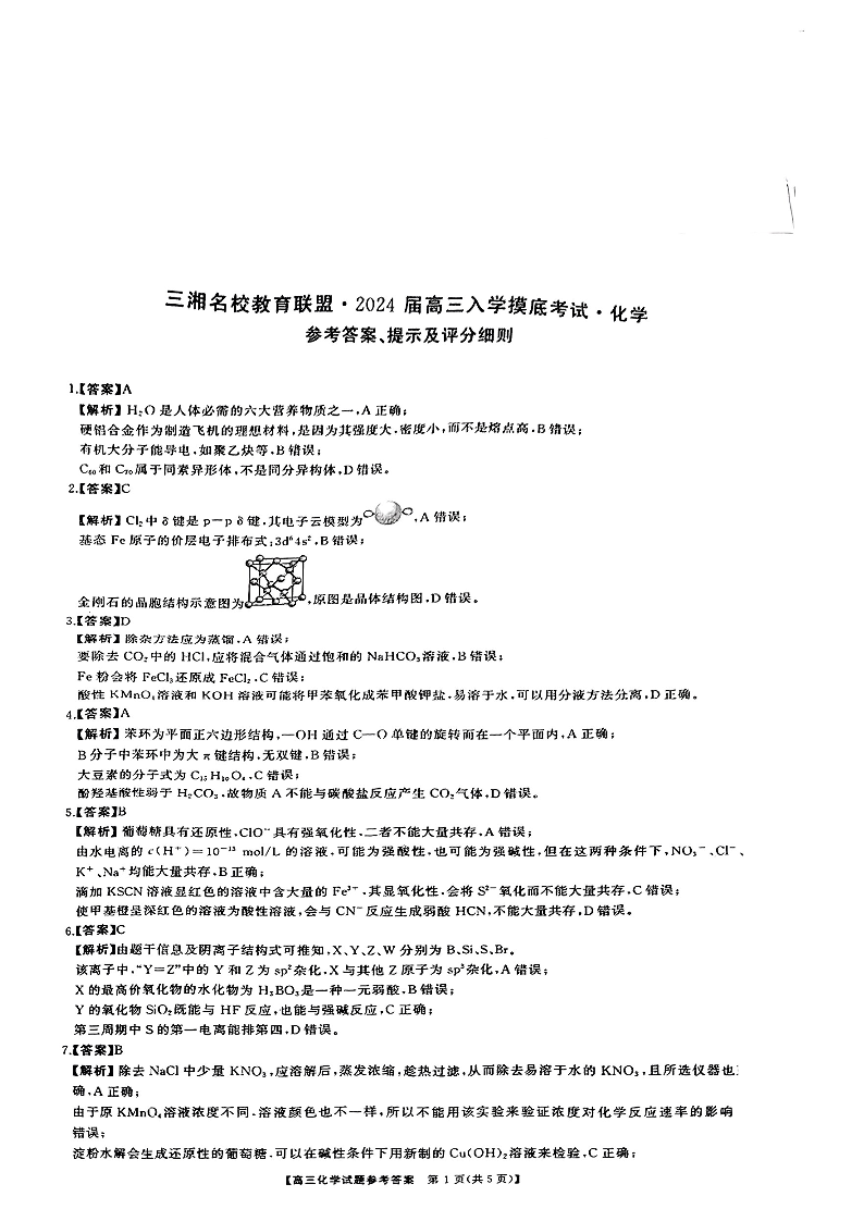 湖南天壹联盟三湘名校2023-2024学年高三下学期入学摸底考试 化学答案