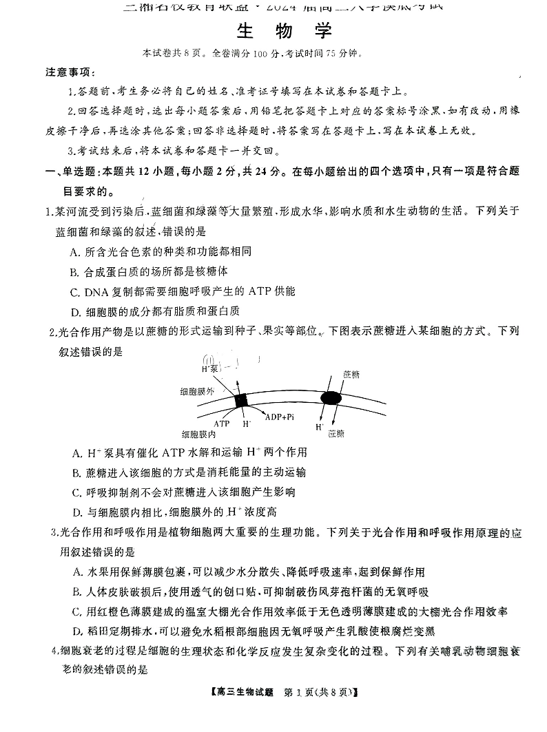 湖南天壹联盟三湘名校2023-2024学年高三下学期入学摸底考试 生物