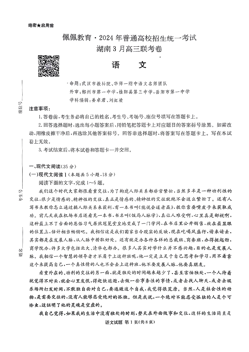 佩佩教育2024年普通高中学业水平选择性考试 湖南3月高三 联考卷 语文