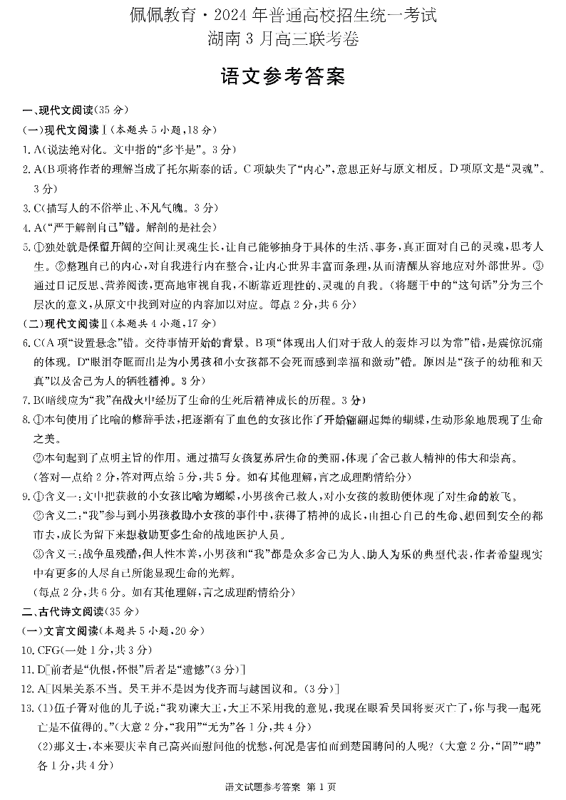 佩佩教育2024年普通高中学业水平选择性考试 湖南3月高三 联考卷 语文答案