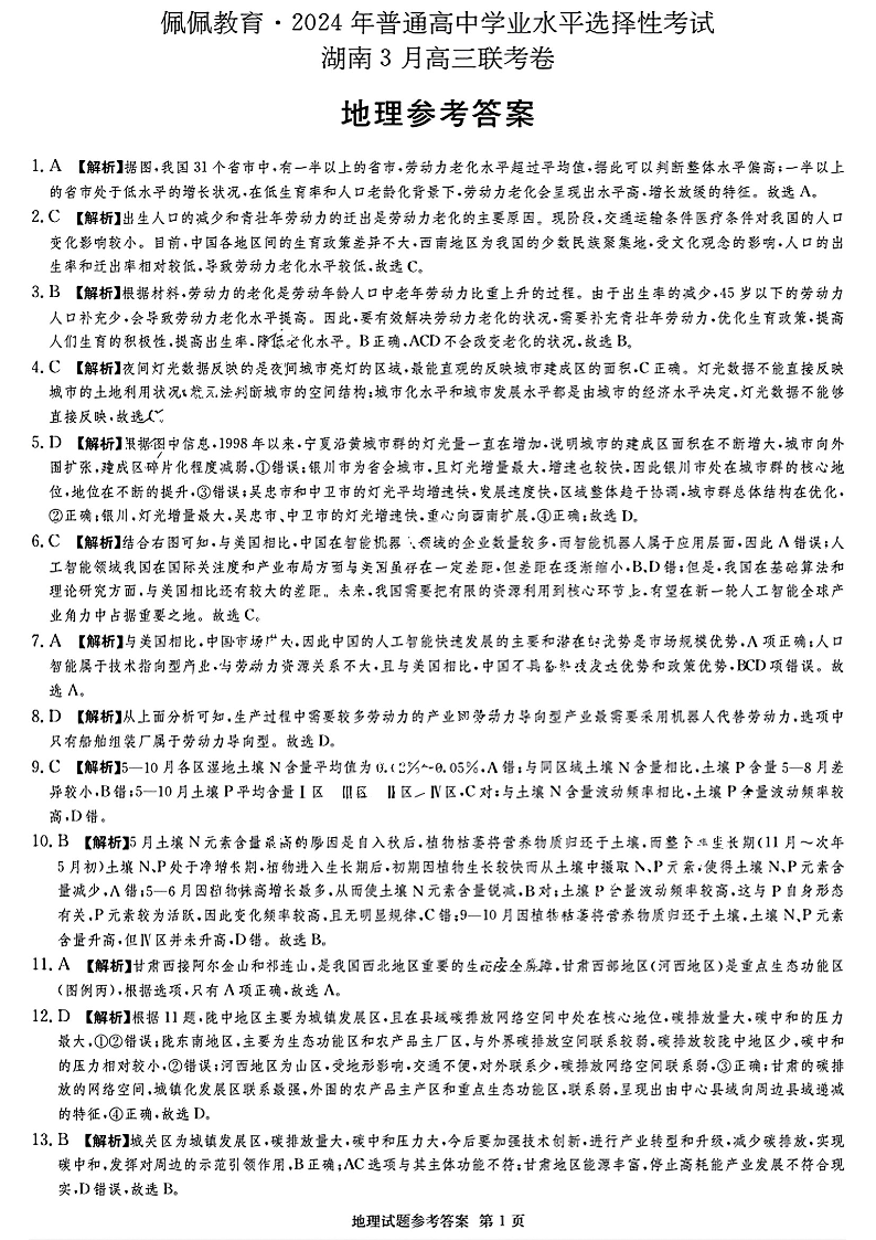 佩佩教育2024年普通高中学业水平选择性考试 湖南3月高三 联考卷 地理答案