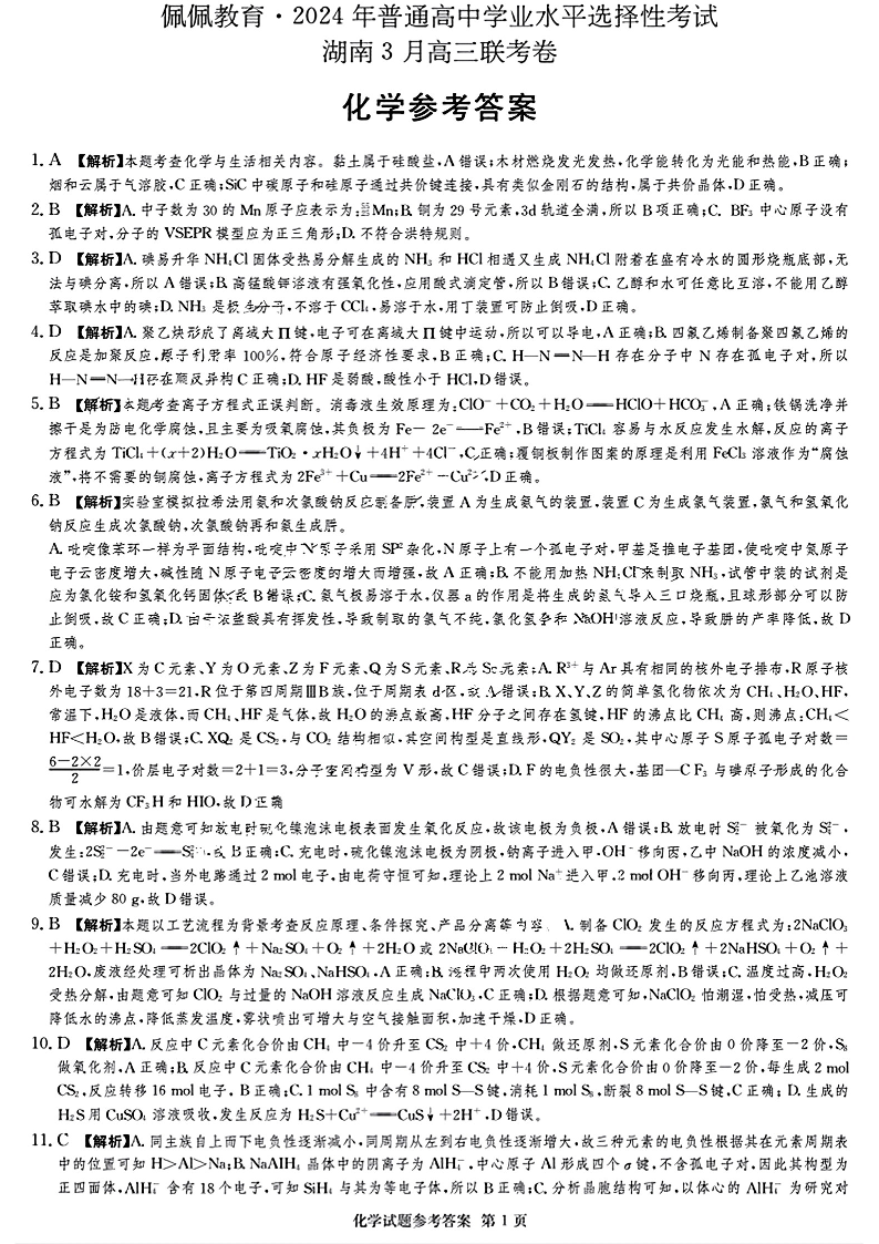 佩佩教育2024年普通高中学业水平选择性考试 湖南3月高三 联考卷 化学答案