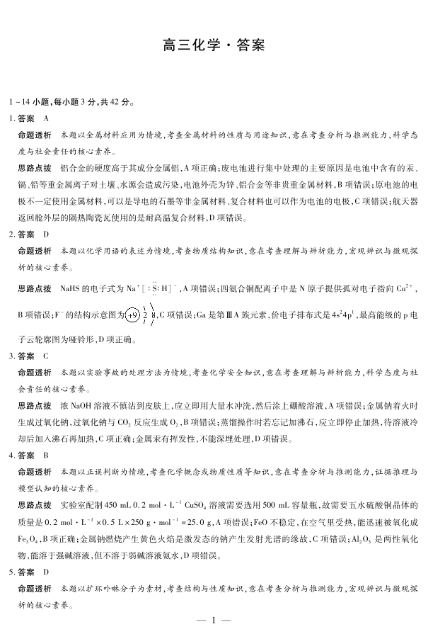 天一大联考2024-2025学年(上)湖南高三一联+化学答案