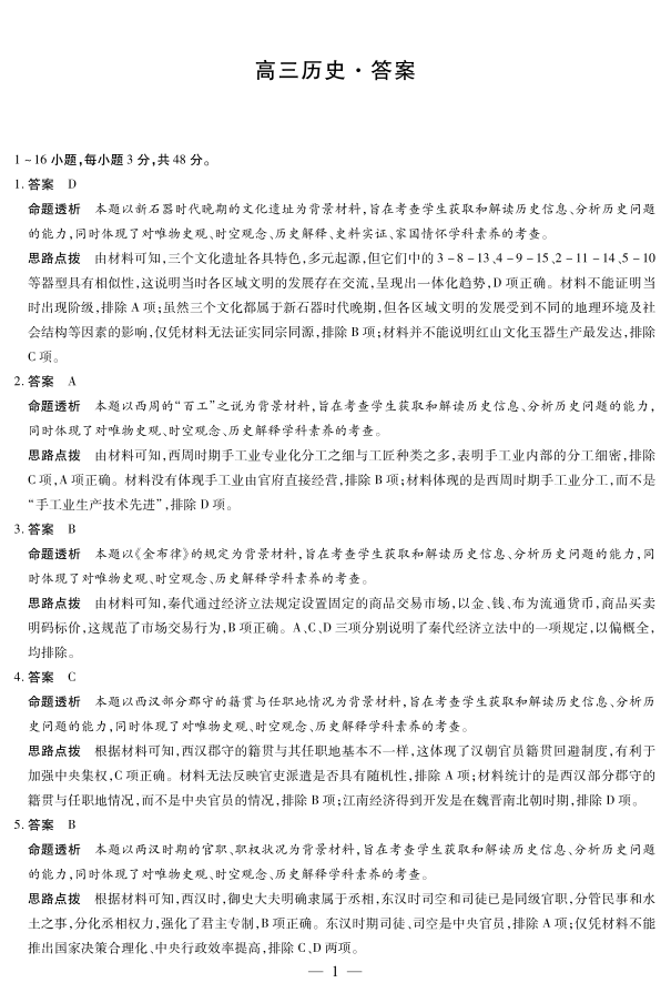 天一大联考2024-2025学年(上)湖南高三一联+历史答案