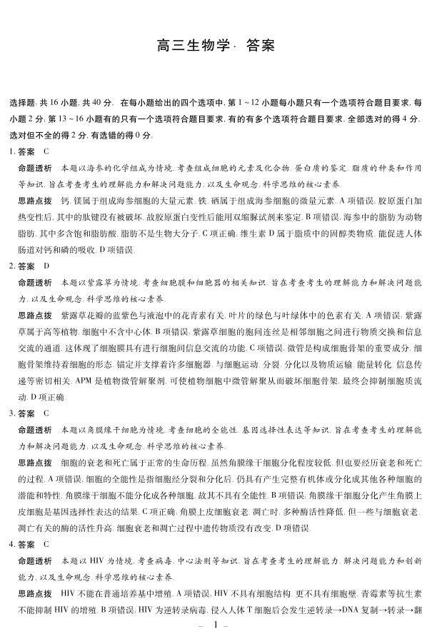 天一大联考2024-2025学年(上)湖南高三一联+生物答案