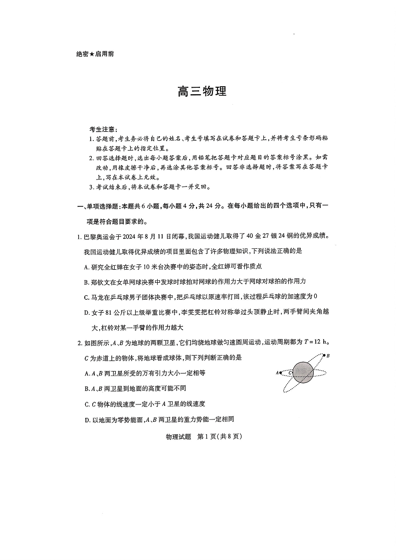 天一大联考2024-2025学年(上)湖南高三一联+物理