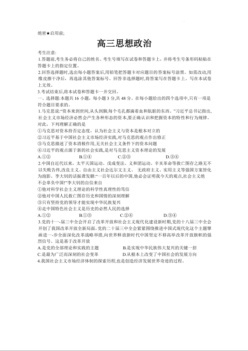 天一大联考2024-2025学年(上)湖南高三一联+政治