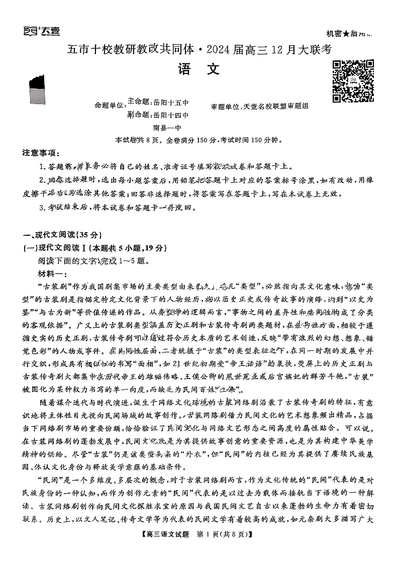 天壹联盟·五市十校教研教改共同体·2024届高三12月大联考 语文