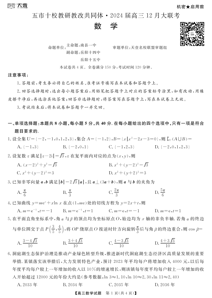天壹联盟·五市十校教研教改共同体·2024届高三12月大联考 数学