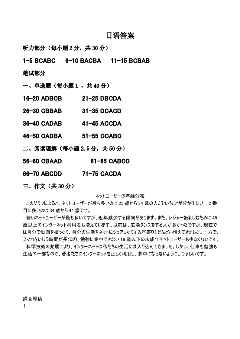 天壹联盟·五市十校教研教改共同体·2024届高三12月大联考 日语答案