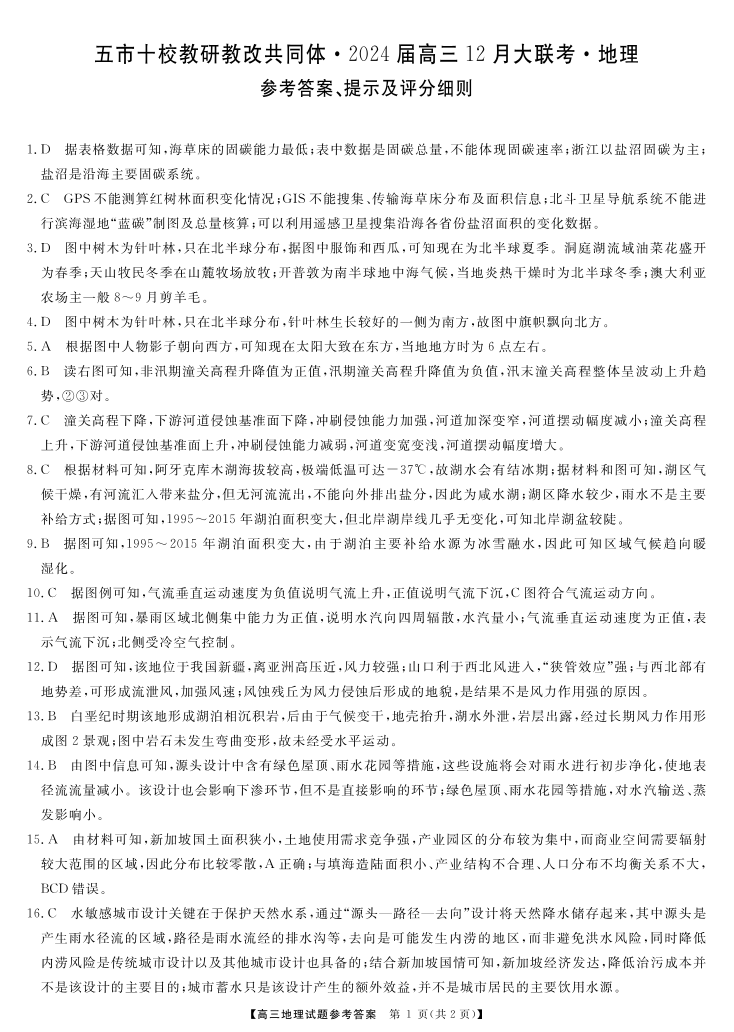 天壹联盟·五市十校教研教改共同体·2024届高三12月大联考 地理答案