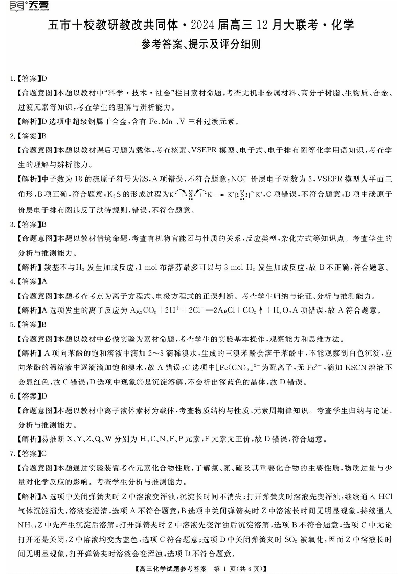 天壹联盟·五市十校教研教改共同体·2024届高三12月大联考 化学答案
