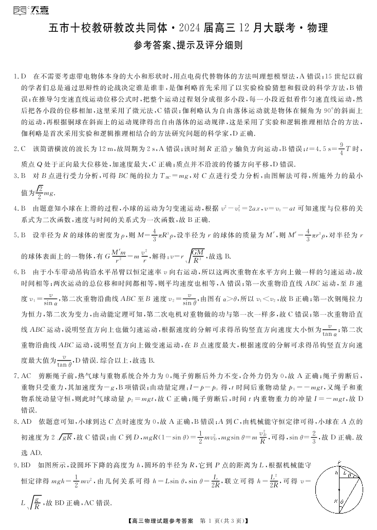 天壹联盟·五市十校教研教改共同体·2024届高三12月大联考 物理答案
