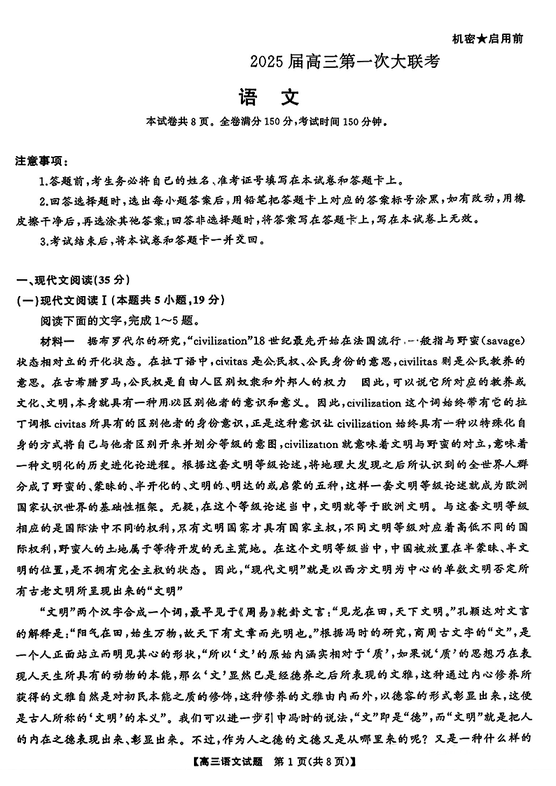 天壹名校联盟&三湘名校教育联盟2025届高三第一次联考+语文