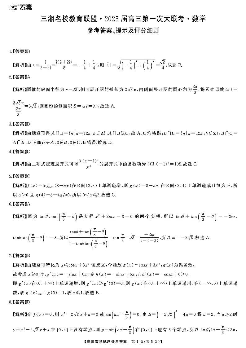 天壹名校联盟&三湘名校教育联盟2025届高三第一次联考+数学答案