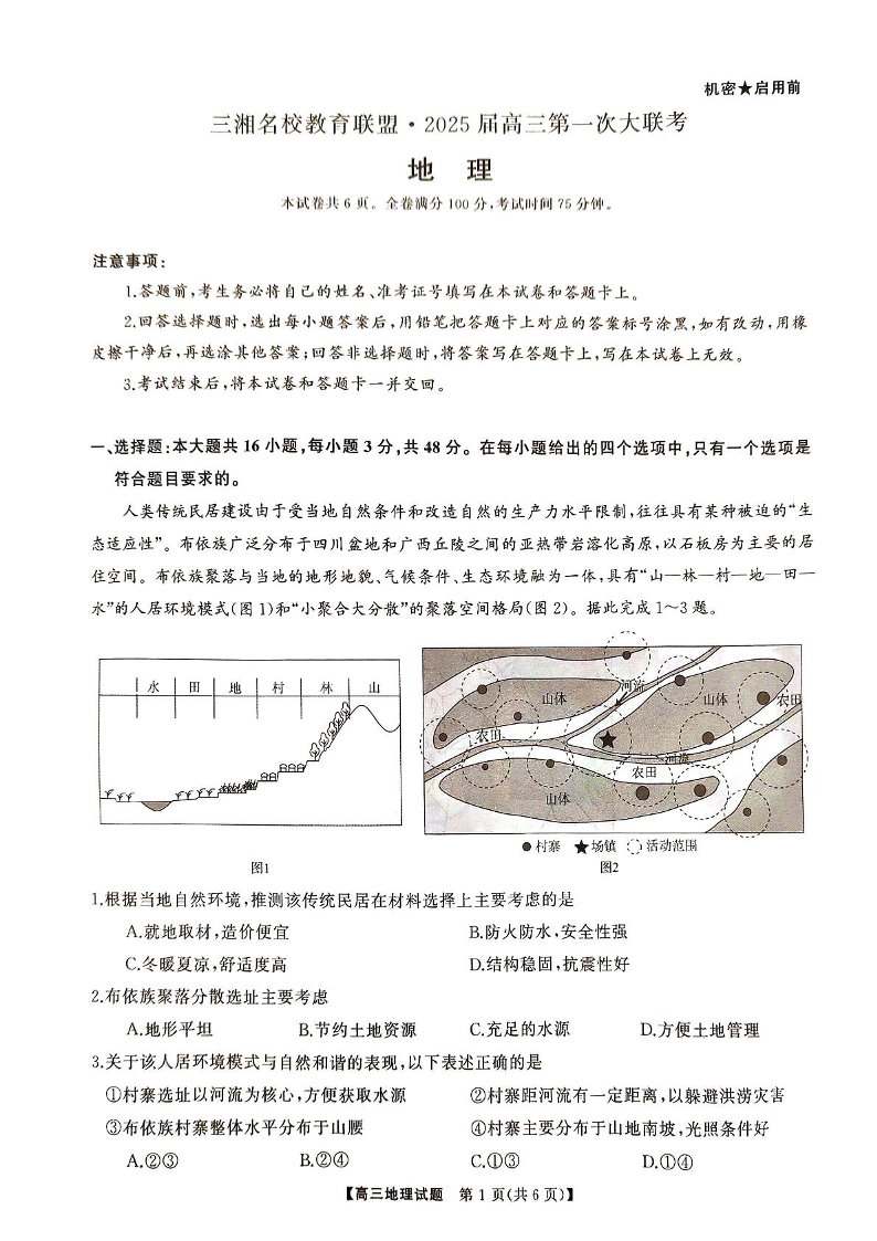 天壹名校联盟&三湘名校教育联盟2025届高三第一次联考+地理
