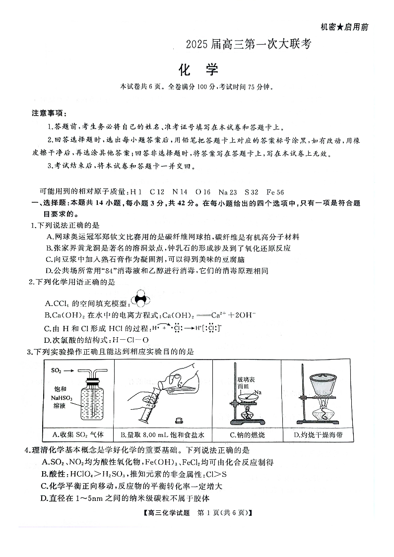 天壹名校联盟&三湘名校教育联盟2025届高三第一次联考+化学