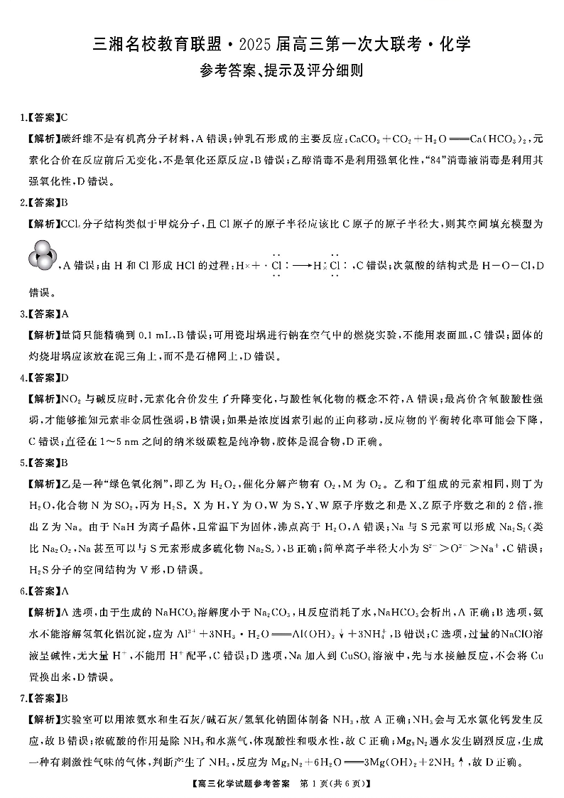 天壹名校联盟&三湘名校教育联盟2025届高三第一次联考+化学答案