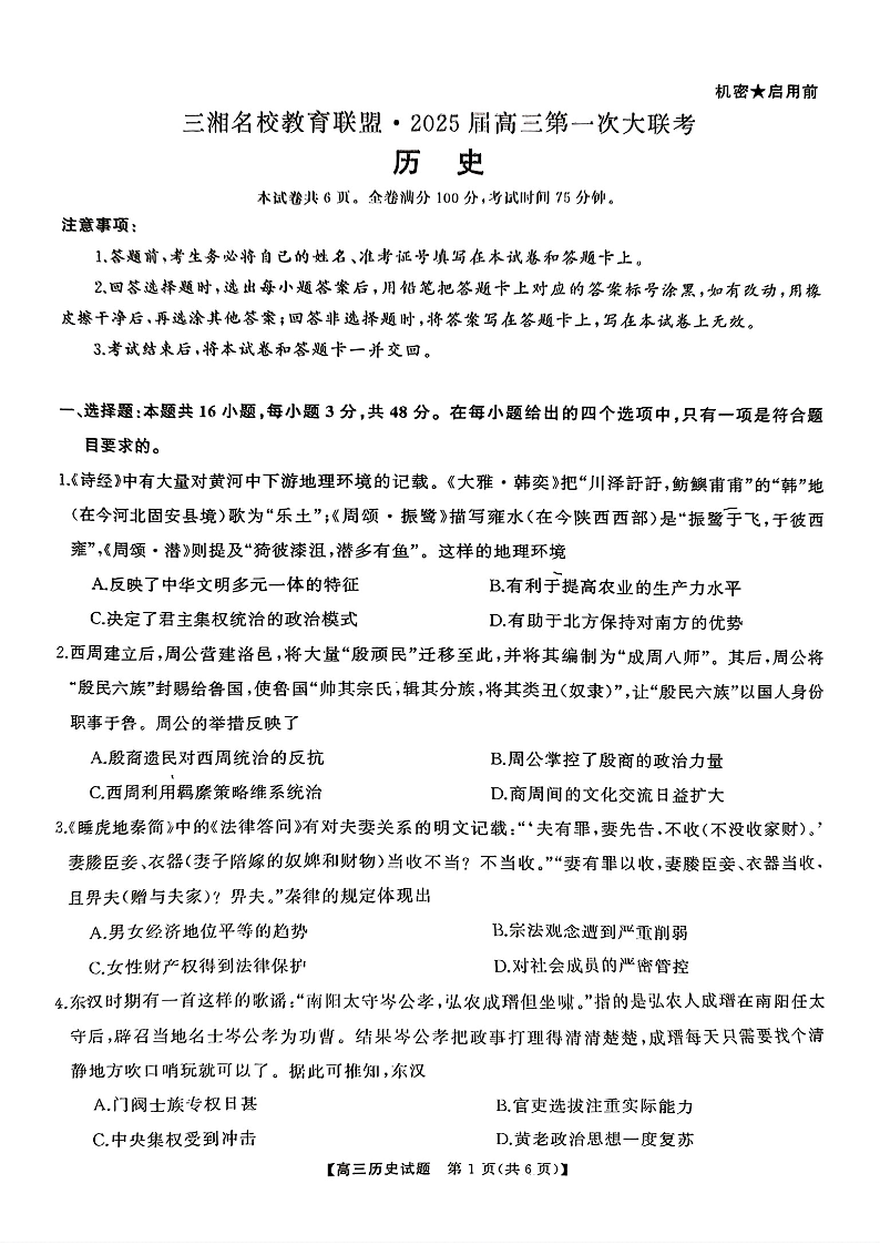 天壹名校联盟&三湘名校教育联盟2025届高三第一次联考+历史