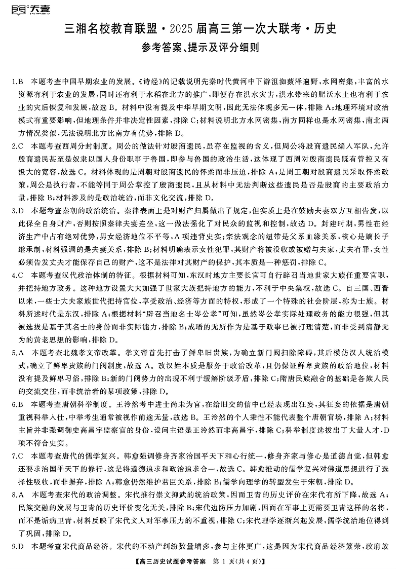 天壹名校联盟&三湘名校教育联盟2025届高三第一次联考+历史答案