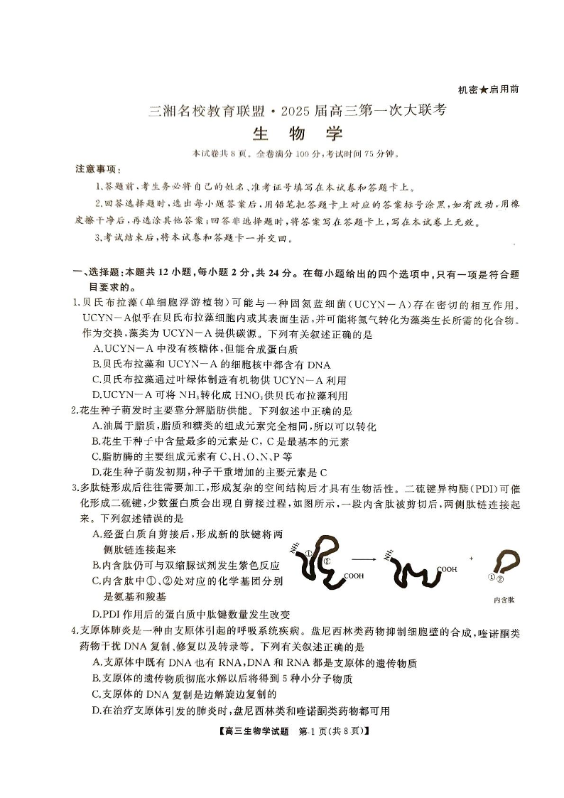 天壹名校联盟&三湘名校教育联盟2025届高三第一次联考+生物