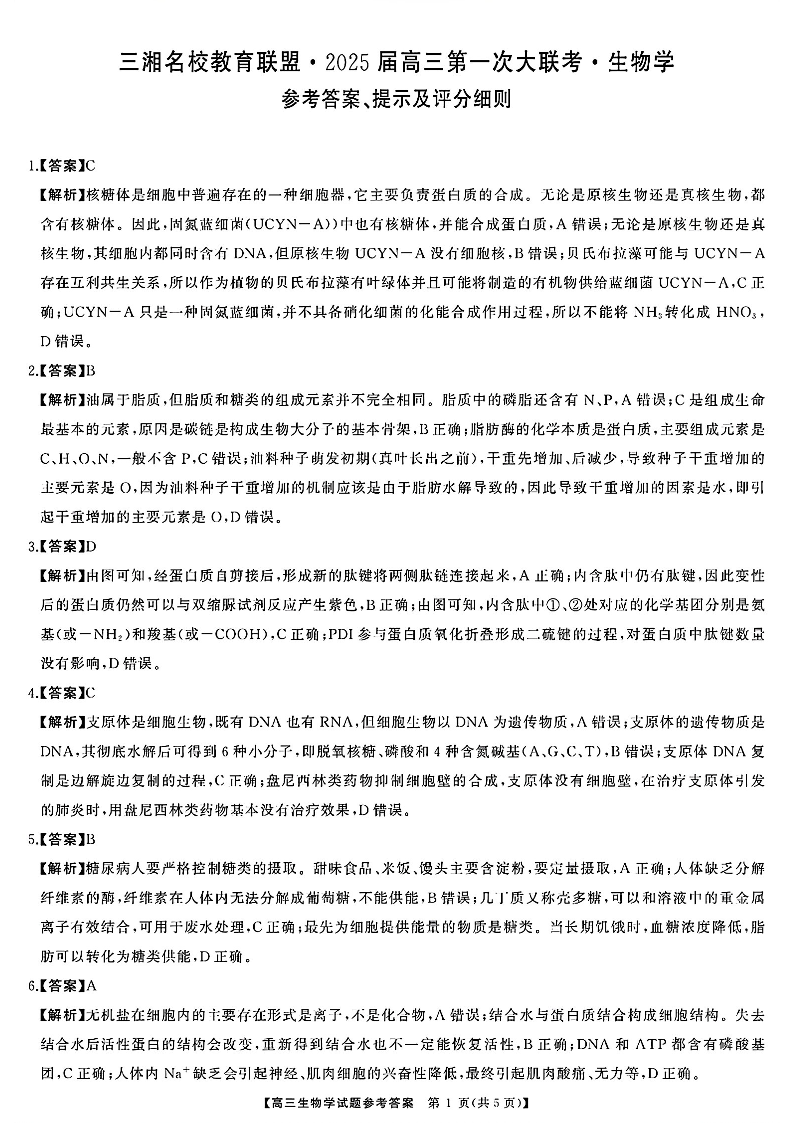 天壹名校联盟&三湘名校教育联盟2025届高三第一次联考+生物答案