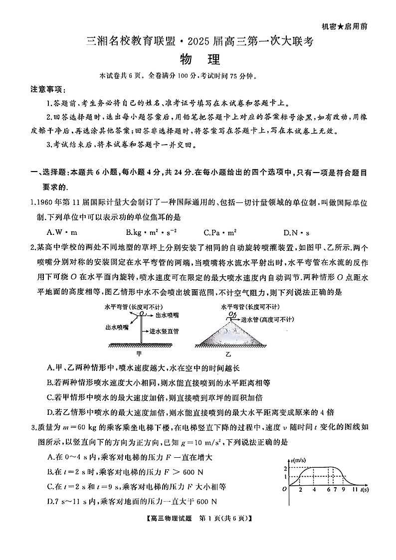 天壹名校联盟&三湘名校教育联盟2025届高三第一次联考+物理