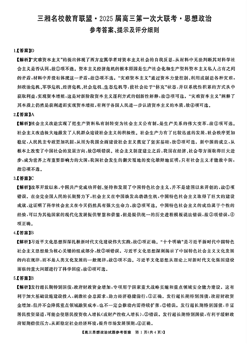 天壹名校联盟&三湘名校教育联盟2025届高三第一次联考+政治答案