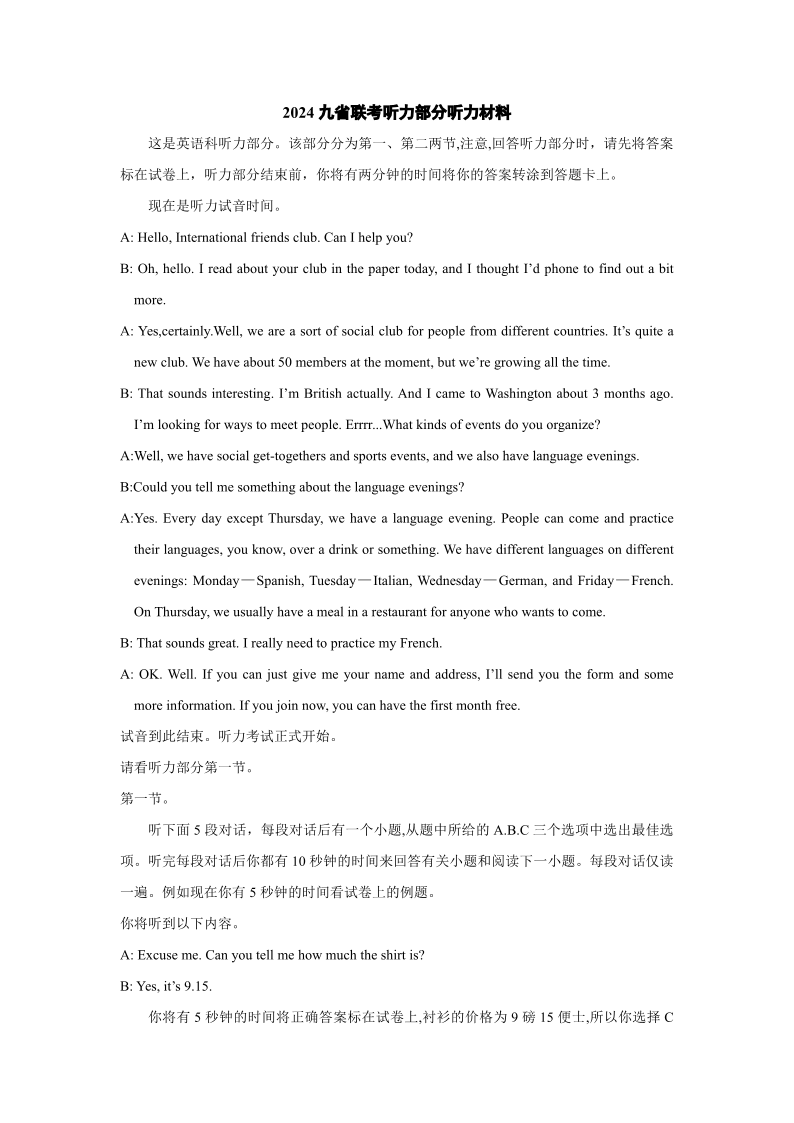 【英语听力文本】2024年九省联考