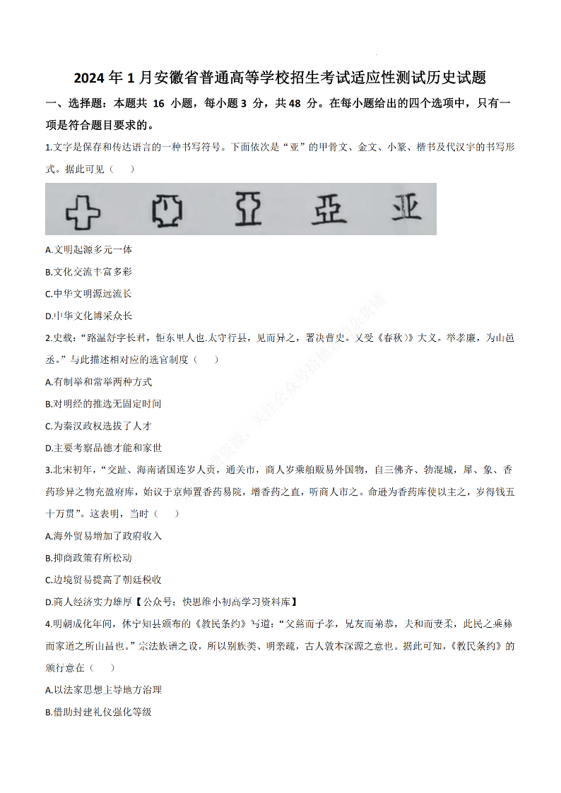 【历史】安徽版2024年九省联考