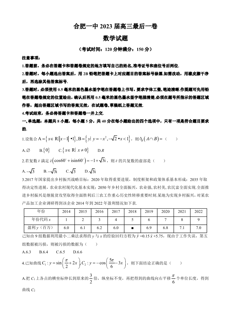 安徽省合肥市第一中学2023届高三最后一卷 数学
