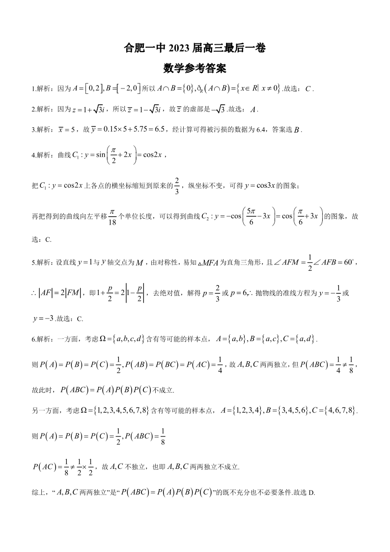 安徽省合肥市第一中学2023届高三最后一卷 数学答案