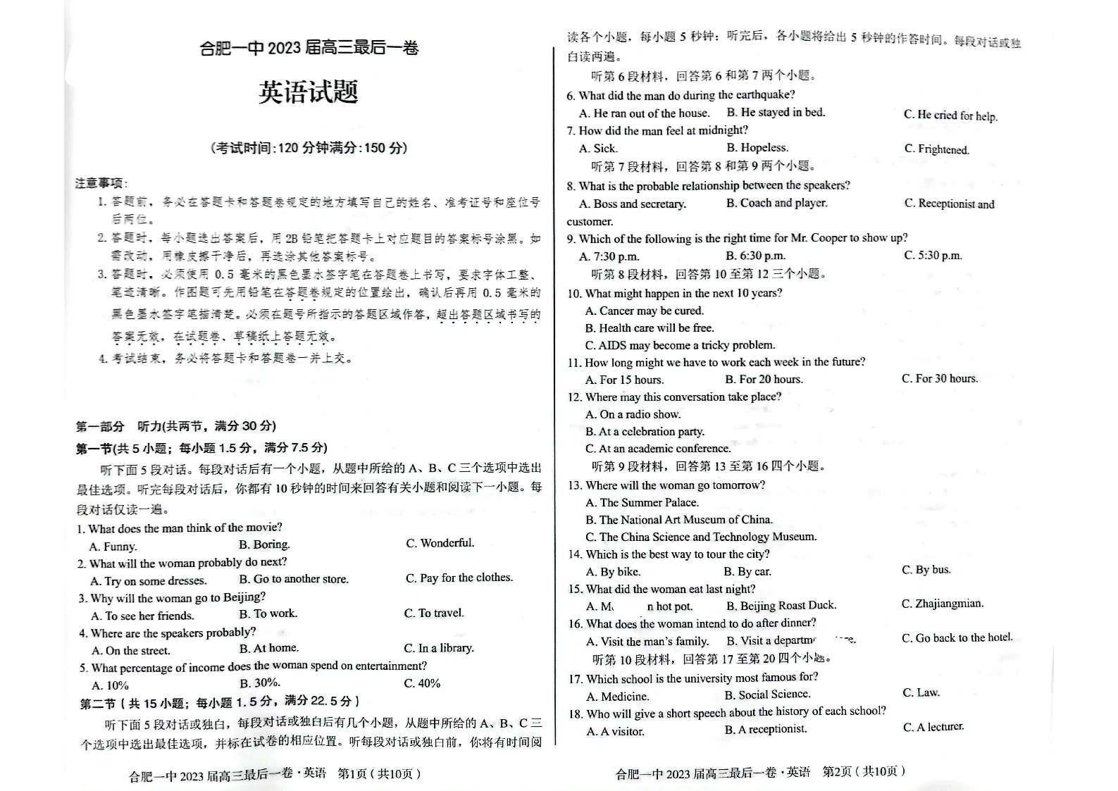 安徽省合肥市第一中学2023届高三最后一卷 英语