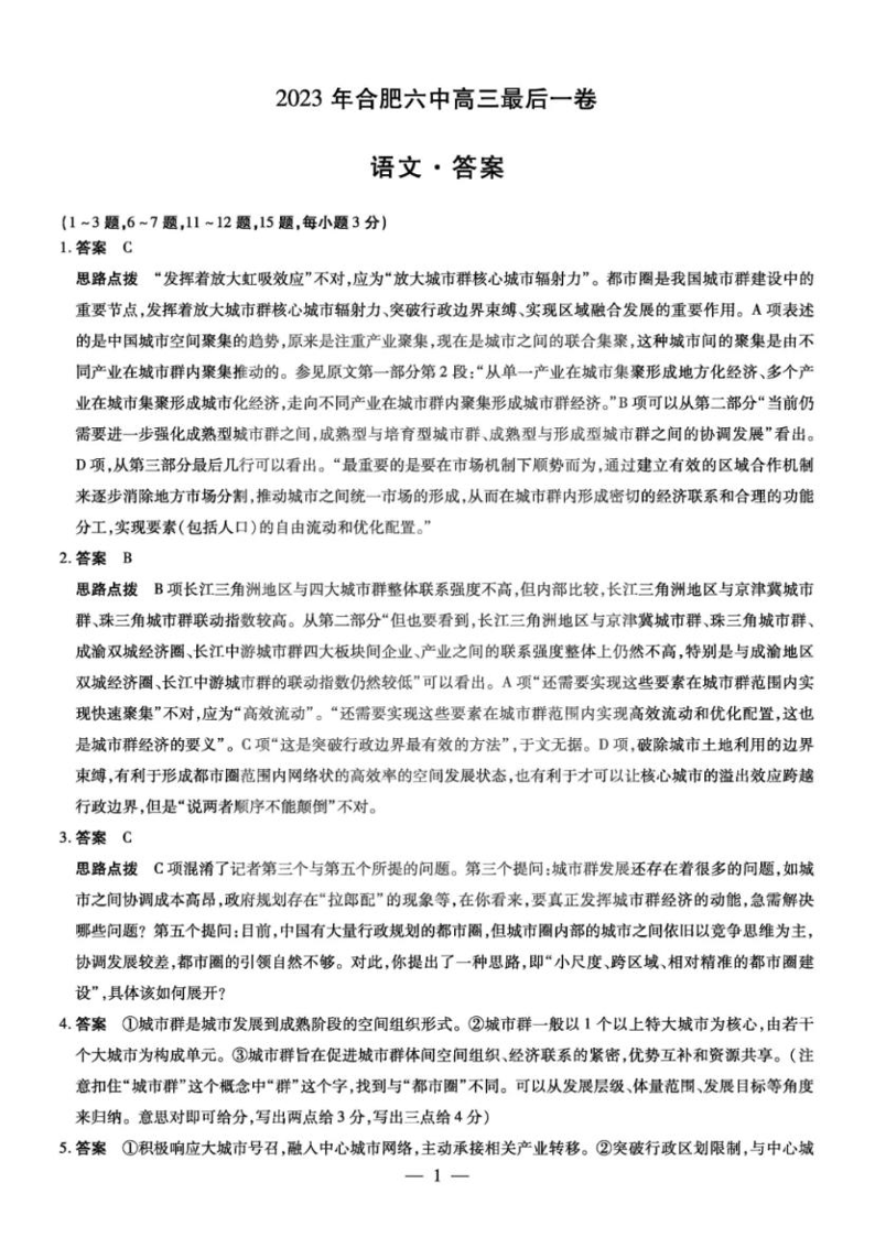 2023届安徽省合肥市第六中学高三最后一卷 语文答案