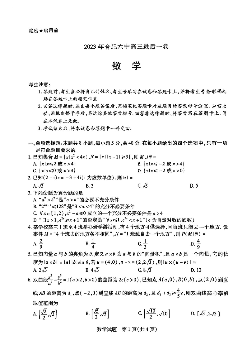 2023届安徽省合肥市第六中学高三最后一卷 数学